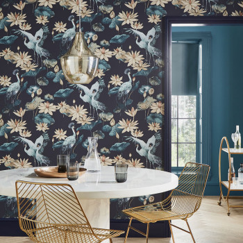 Luxuriöse Vliestapete mit Lotos- und Wasservogelmotiv in Türkis und Beige auf schwarzem Hintergrund.