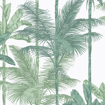 Vliestapeten mit dem Motiv grüner Bananenbäume und Palmen schaffen eine angenehme Atmosphäre im Innenraum.