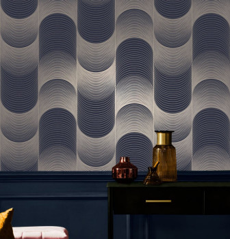 Vliestapete mit silbernen Wellen auf dunkelblauem Hintergrund bringt Luxus und Noblesse ins Interieur.