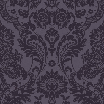 Luxuriöse lila Vliestapete mit Flockornamenten.