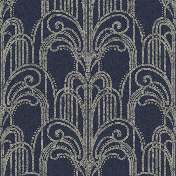 Luxuriöse dunkelblaue Vliestapete mit grauen Metallic-Ornamenten im Art-Deco-Stil.