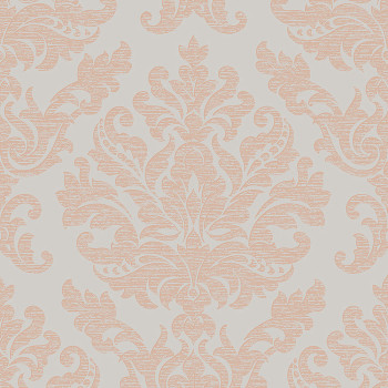 Luxuriöse Vliestapete in hellgrauer Farbe mit metallischen Ornamenten.