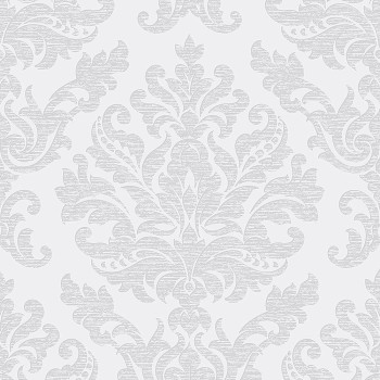 Luxuriöse Vliestapete in hellgrauer Farbe mit metallischen Ornamenten.
