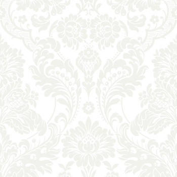 Luxuriöse weiße Vliestapete mit Flockornamenten.