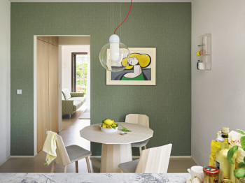 Vliestapete mit Vinyloberfläche, grüner Stoffimitat mit kleinen Punkten, Stoffstruktur.