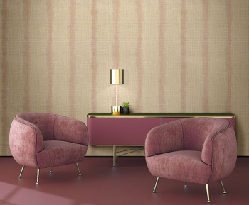 Luxustapete mit Vinyloberfläche mit markanter rauen Textur in Beige mit Gold- und Kupferstreifen mit metallischen Reflexen.
