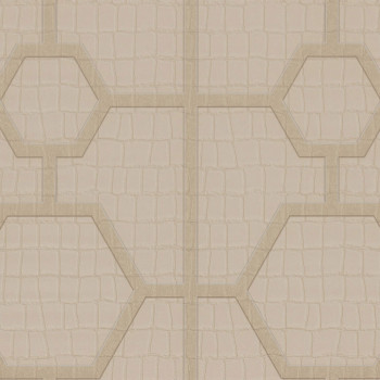 Luxuriöse geometrische Vliestapete mit einer Vinyloberfläche mit goldenen Ornamenten auf einem beigen Hintergrund, der Krokodilleder imitiert.