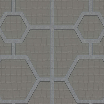Luxuriöse geometrische Vliestapete mit einer Vinyloberfläche mit silbernen Ornamenten auf einem grauen Hintergrund, der Krokodilleder imitiert.