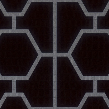 Luxuriöse geometrische Vliestapete mit einer Vinyloberfläche mit silbernen Ornamenten auf einem schwarzen Hintergrund, der Krokodilleder imitiert.