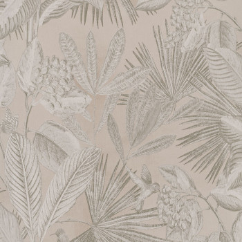 Beige Vliestapete, Motiv Blätter und Vögel, Stoffstruktur.