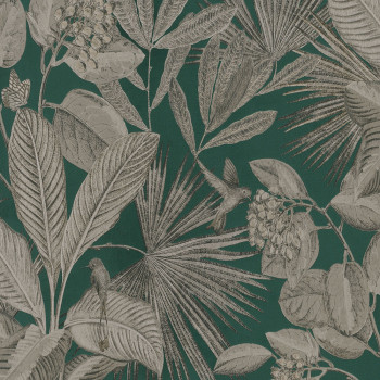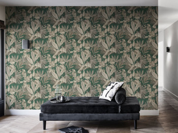 Grüne Vliestapete, Motiv Blätter und Vögel, Stoffstruktur.