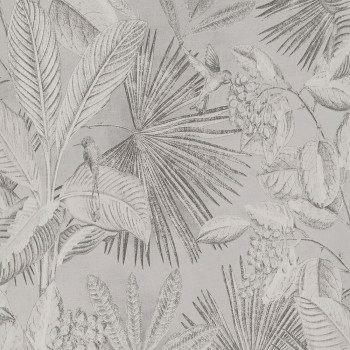 Graue Vliestapete, Motiv Blätter und Vögel, Stoffstruktur.