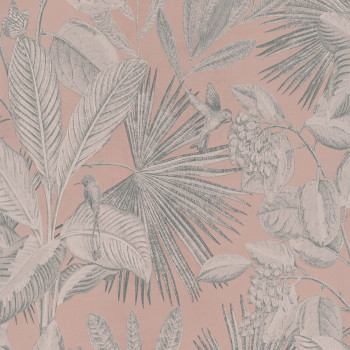 Rosa Vliestapete, Motiv Blätter und Vögel, Stoffstruktur.