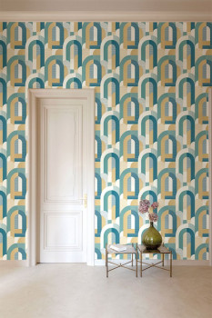 Grafische Vliestapete im Art-déco-Stil in Türkis-, Beige- und Cremetönen.