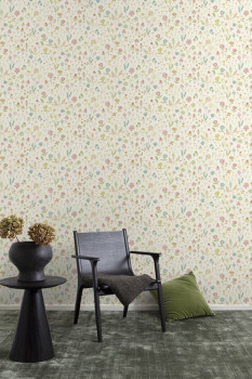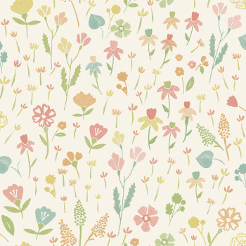 Cremefarbene Vliestapete, Blumen in Grüntönen, Türkis, Ocker und Rosa.