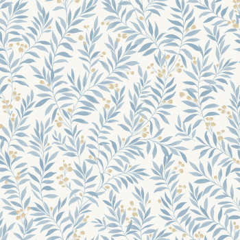 Blaue Vliestapete, Zweige und Blätter. Die Tapete eignet sich für Schlafzimmer, Flur oder Wohnzimmer.