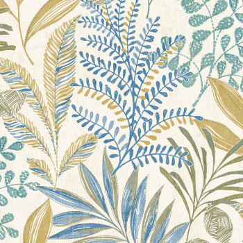 Vliestapete, Blätter in Blau-, Ocker- und Türkistönen auf cremefarbenem Hintergrund.