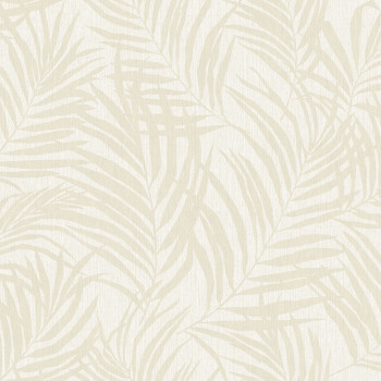 Beige Vliestapete, halbglänzende goldene Palmblätter.