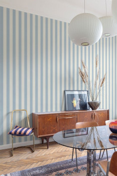 Gestreifte Tapete, Imitation von gestreiftem Stoff in Blau- und Cremetönen.