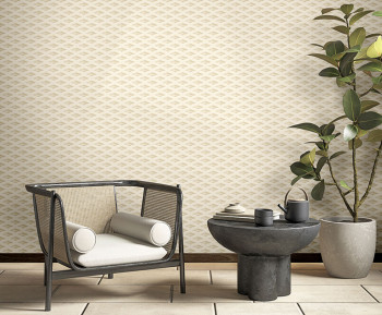 Luxuriöse geprägte Vliestapete mit Vinyloberfläche, in Beige- und Cremetönen mit metallischem Halbglanz.