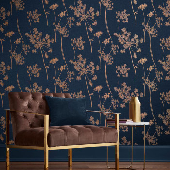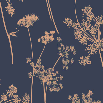 Vliestapete mit hochwertiger Papieroberfläche - matt dunkelblauer Hintergrund, metallisch bronzefarbene Umrisse von Wiesenblumen, Gras.