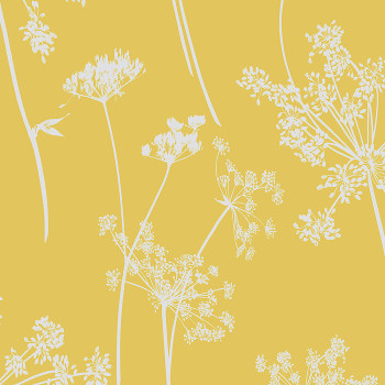 Vliestapete mit hochwertiger Papieroberfläche - ockerfarbener Hintergrund, Umrisse von silbernen Wiesenblumen, Gras.