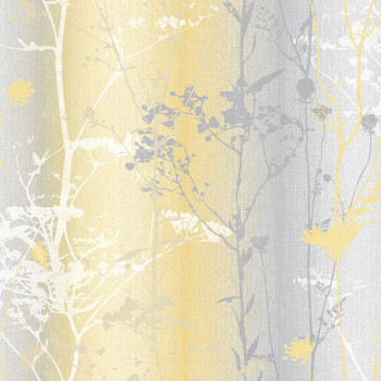 Vliestapete mit hochwertiger Papieroberfläche - Gelbgrau mit Ombré-Effekt, goldene und metallisch-beige Wiesenblumen.