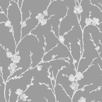 Vliestapete mit hochwertiger Papieroberfläche - grauer matter Hintergrund, silberne Kirschblütenzweige.