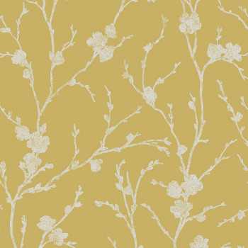 Vliestapete mit hochwertiger Papieroberfläche - safranfarbener Hintergrund, silberne Kirschblütenzweige.