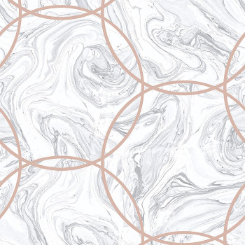 Vliestapete mit glatter Papieroberfläche, grauer Marmor, metallische Kreise roségold.