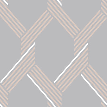 Graue Vliestapete mit glatter Papieroberfläche, geometrisches Muster in roségoldener Farbe.