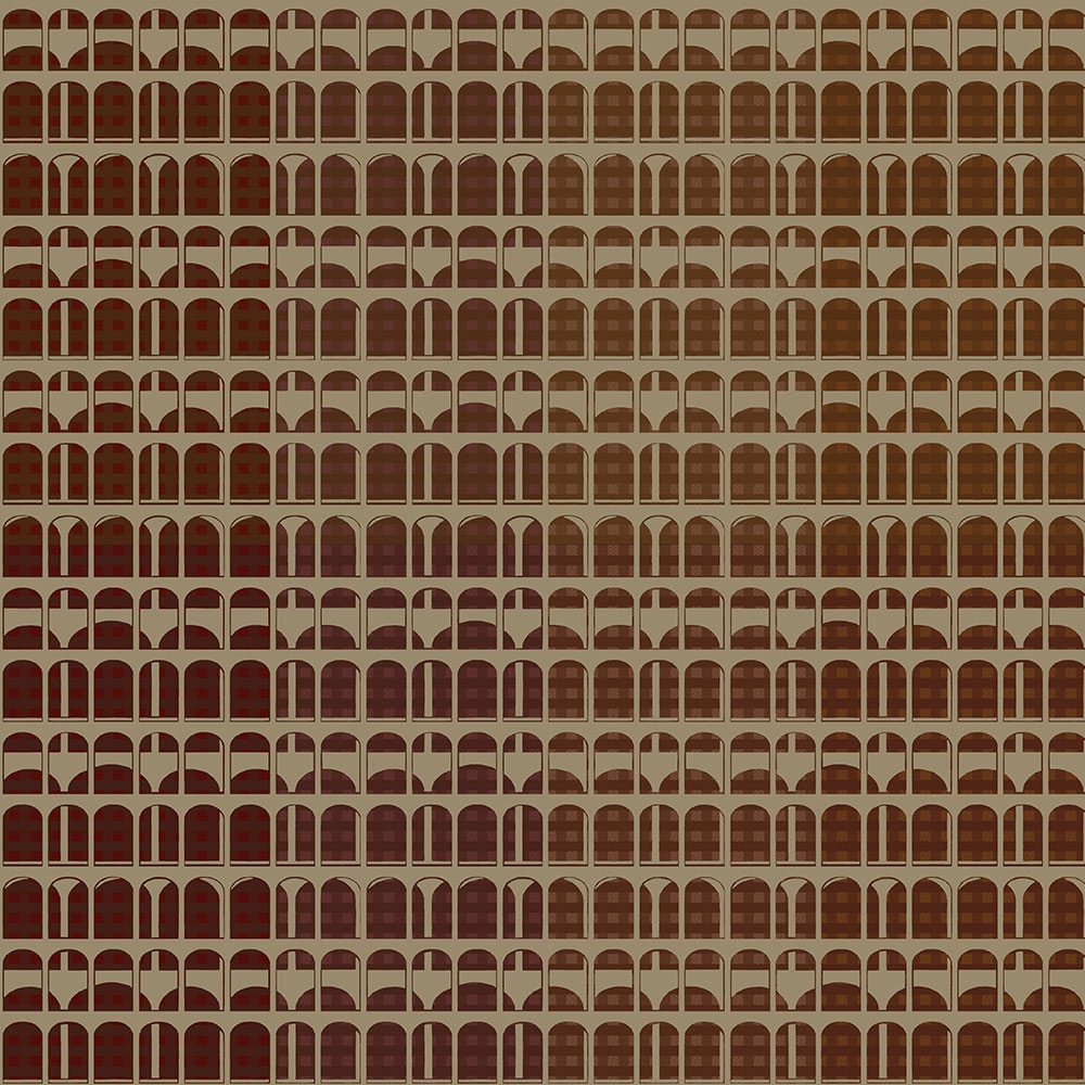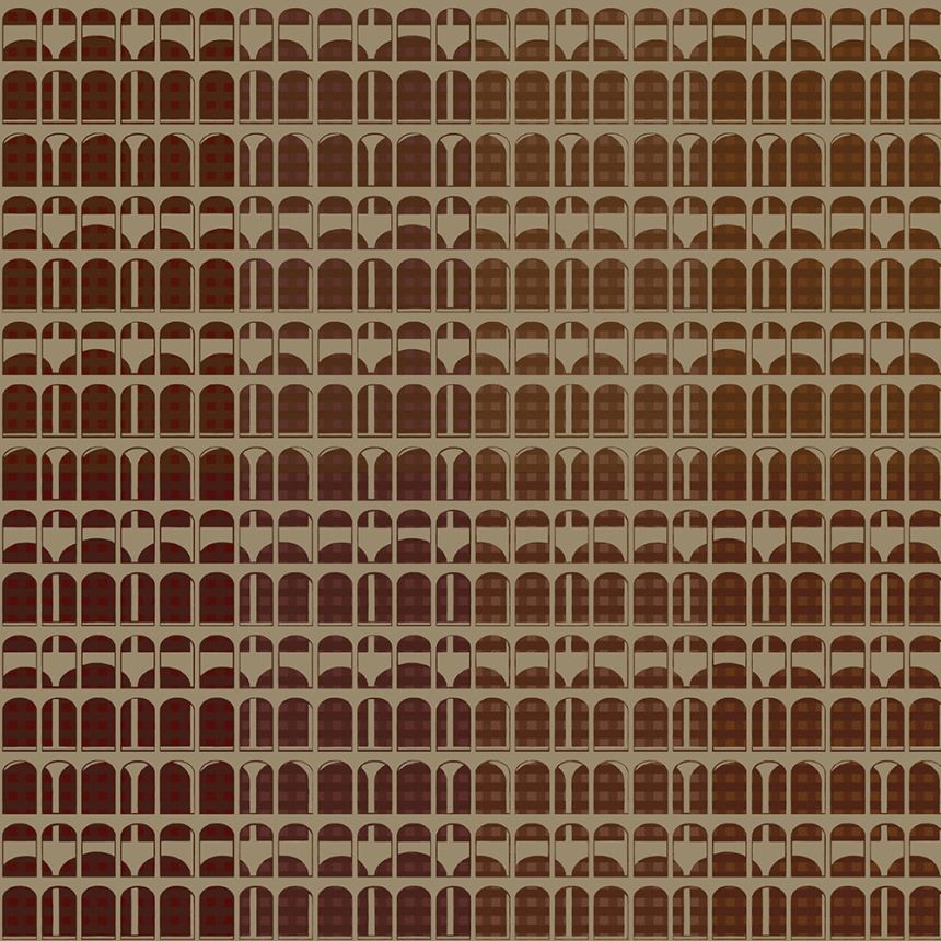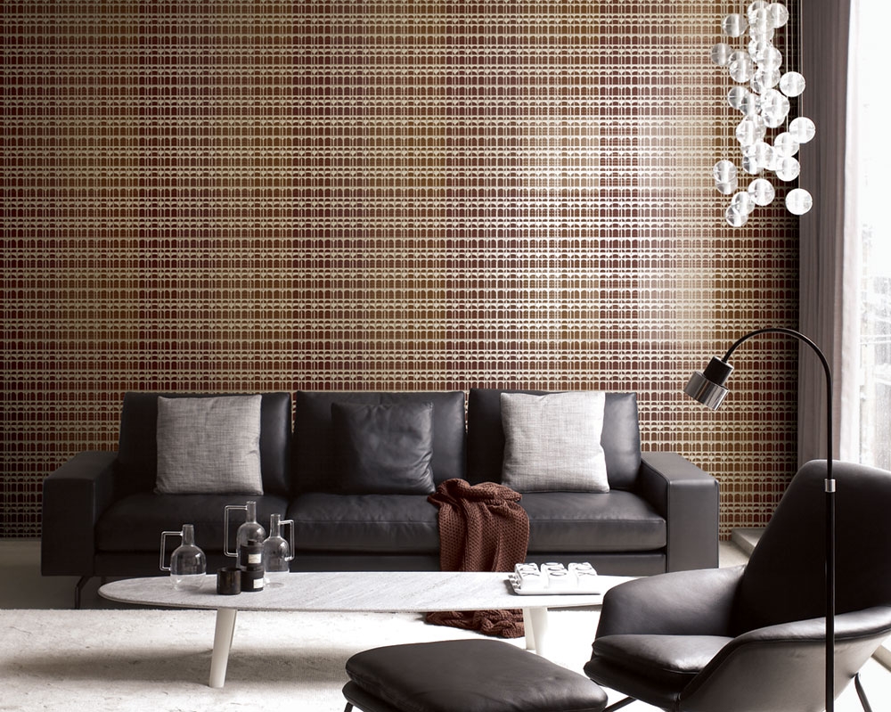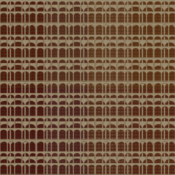 Vliestapete für die Wand. Muster in metallischen Goldtönen, der Hintergrund in Weinrot- und Brauntönen.