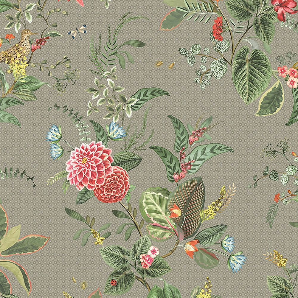 Vliestapete mit subtil geprägter Textur. Große Blumen, Pflanzen und Vögel. Der Hintergrund ist Khaki mit einem kleinen „Sonnen“-Muster.