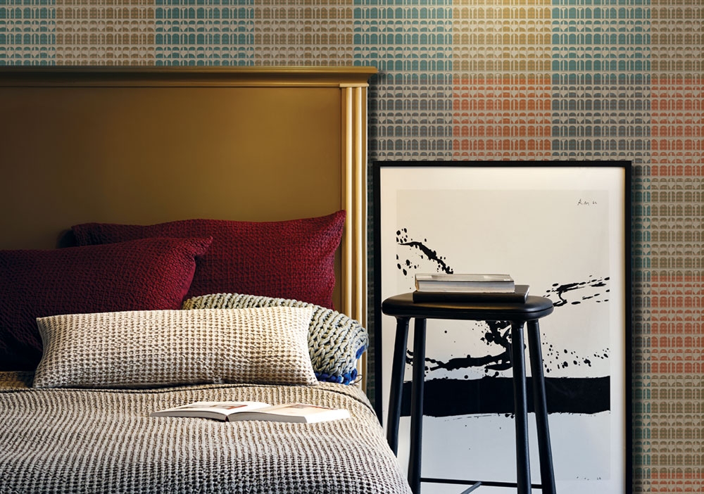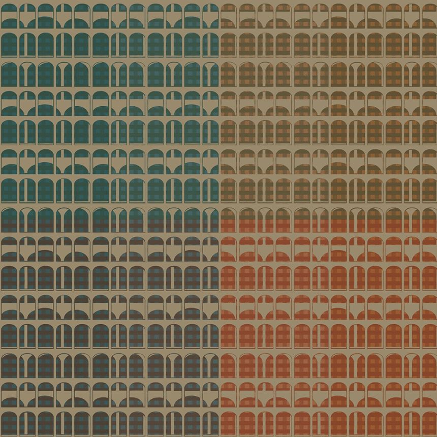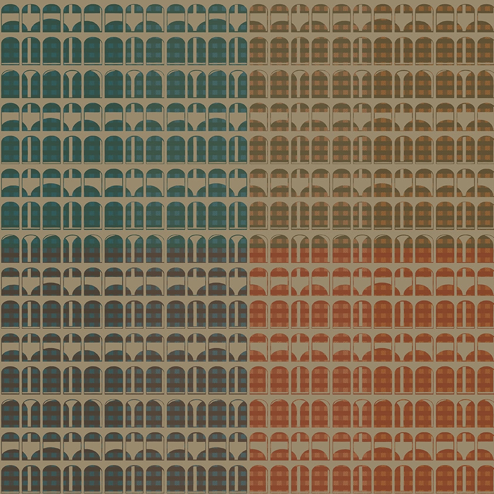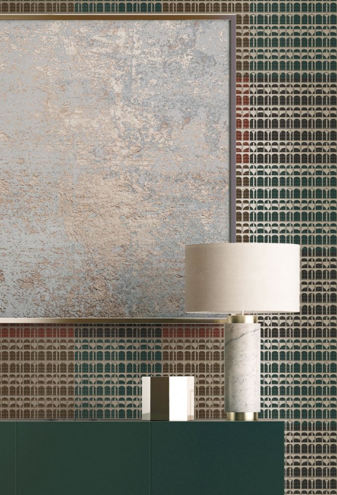 Vliestapete für die Wand. Muster in Türkis-, Ziegel- und Brauntönen.