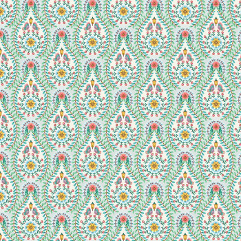 Vliestapete mit glatter Struktur. Ein zartes Regentropfendesign, das aus vielen Schichten elegant platzierter kleiner Blumen, Blätter und Schmetterlinge besteht.