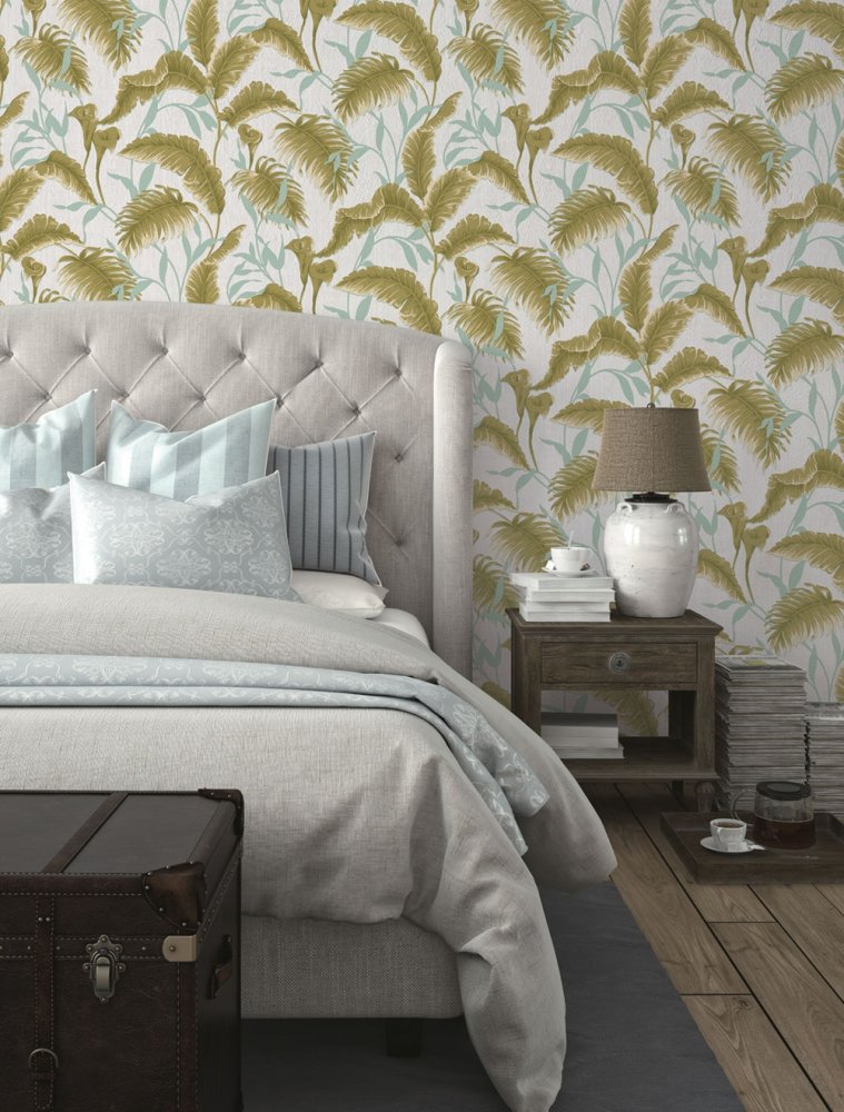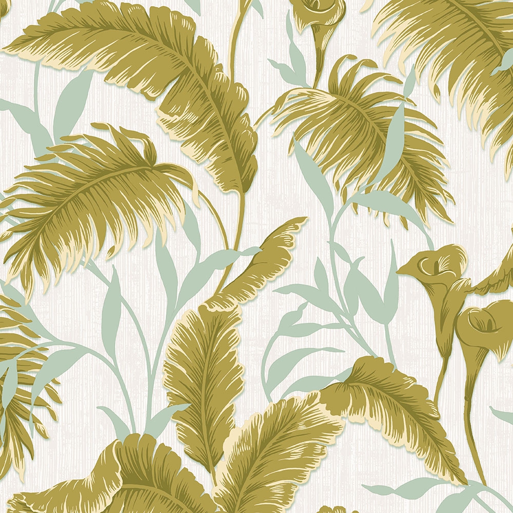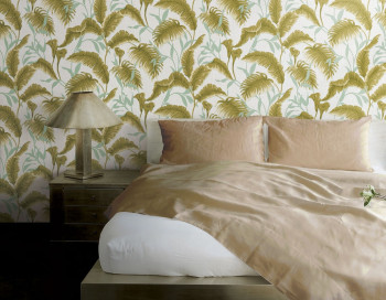 Vliestapete für die Wand mit Stoffstruktur. Perlenhintergrund, Blätter in Grün- und Hellbeigetönen.
