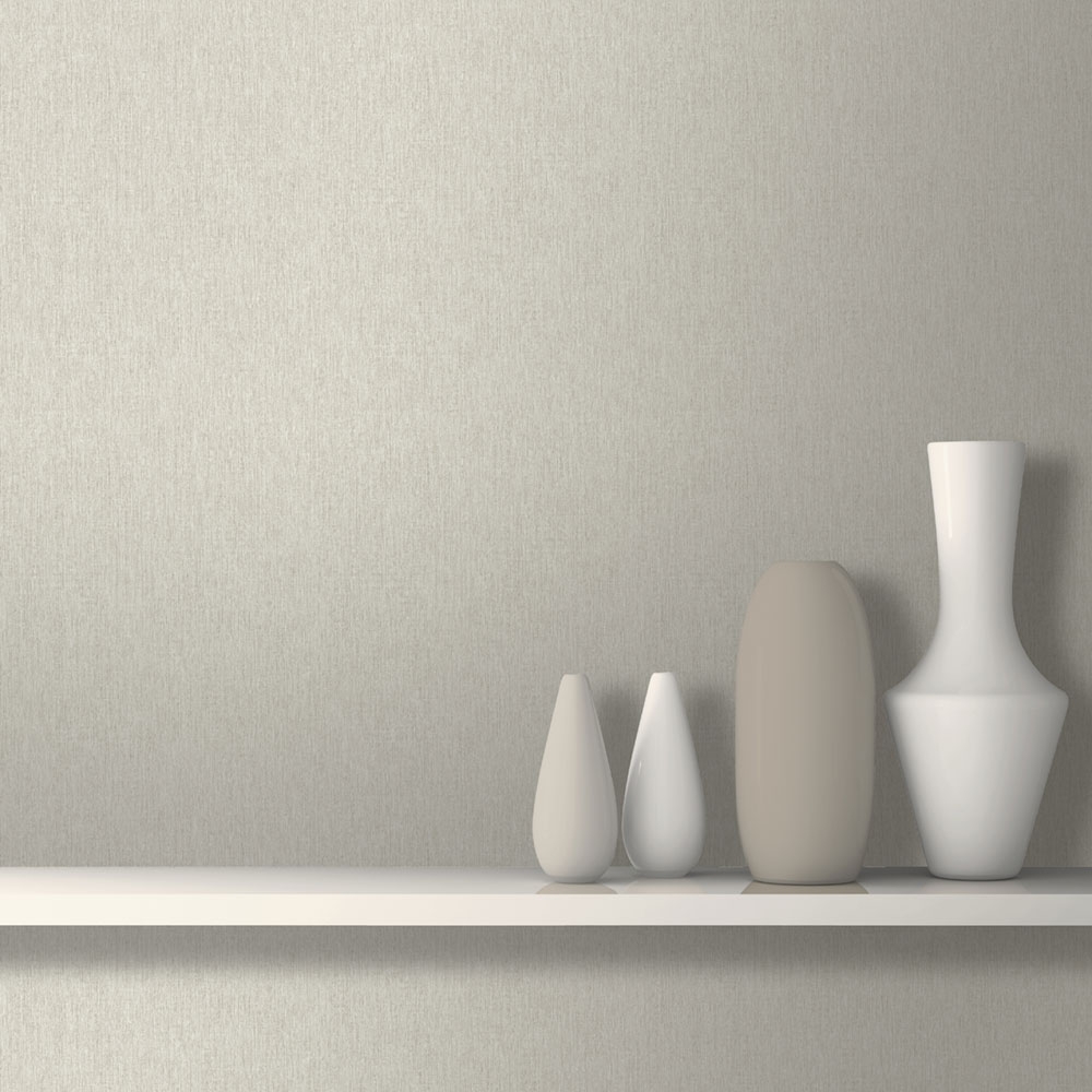 Rollenbreite 1,06 m. Elegante abwaschbare Tapete mit feiner Struktur in Grau-Beige-Tönen, silbriger Glanz, der sich je nach Lichteinfall verändert.