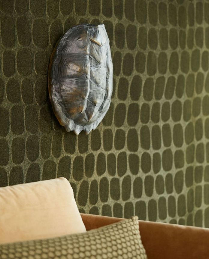 Tapete - Krokodilhaut-Imitat. Plastische Textur aus samtweichem Flock in Khaki- und Grüntönen. Wir empfehlen, ein Muster anzufordern.