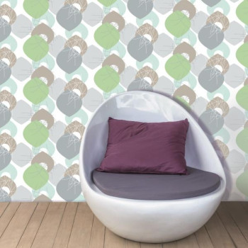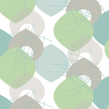 Muster in Grau, Türkis und Grün auf weißer Vliestapete.