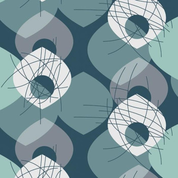 Muster in Weiß, Grau, Graublau und Grün auf blauer Vliestapete.