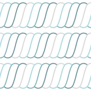 Geometrisches Muster in Türkis und Grau auf weißer Vliestapete.