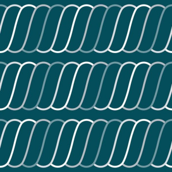 Geometrisches Muster in Türkis, Weiß und Grau auf dunkelblauer Vliestapete.