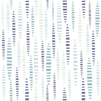 Lila- und Türkismuster auf weißer Vliestapete.