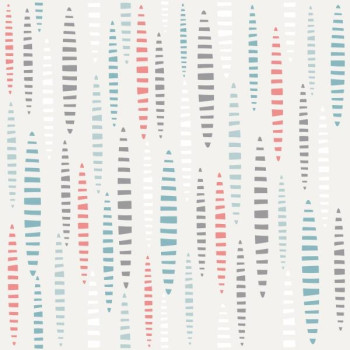 Geometrische Muster in Grau, Türkis und Rot auf weißer Vliestapete.