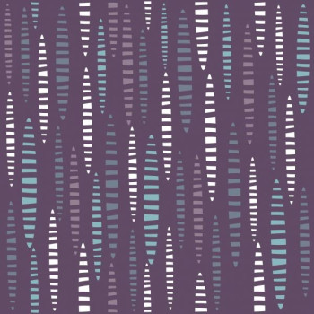 Geometrische Muster in Türkis und Weiß auf lila Vliestapete.