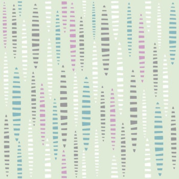 Geometrische Muster in Lila, Türkis und Grau auf grüner Vliestapete.