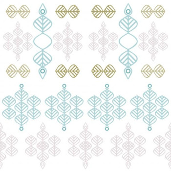 Türkises, violettes und grünes Muster auf weißer Vliestapete.