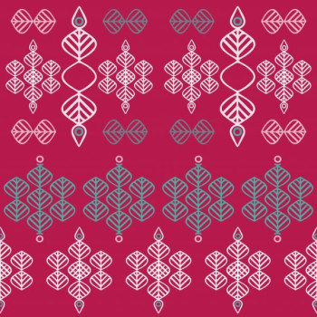 Türkis- und rosafarbenes Muster auf roter Vliestapete.