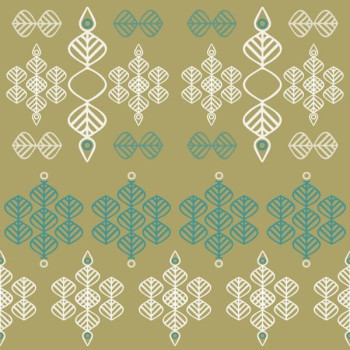 Türkis-weißes Muster auf grüner Vliestapete.