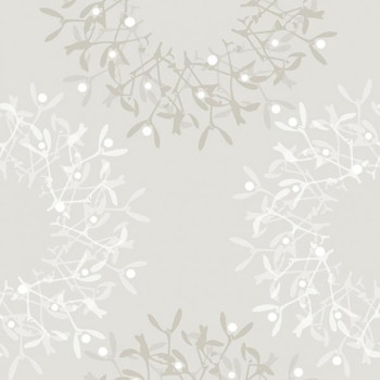 Mistelkränze in Graubeige und Weiß auf grauer Vliestapete.